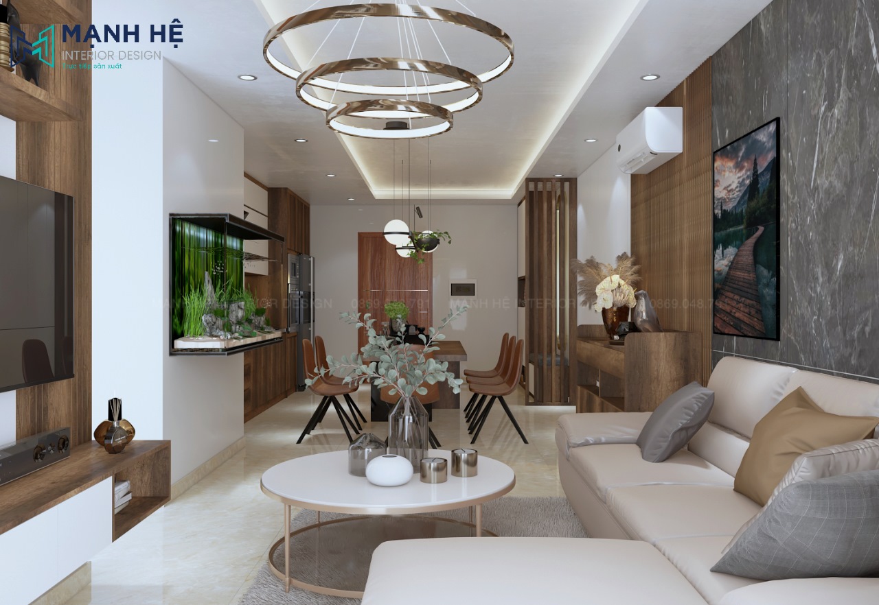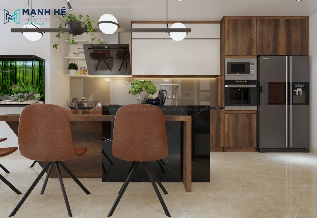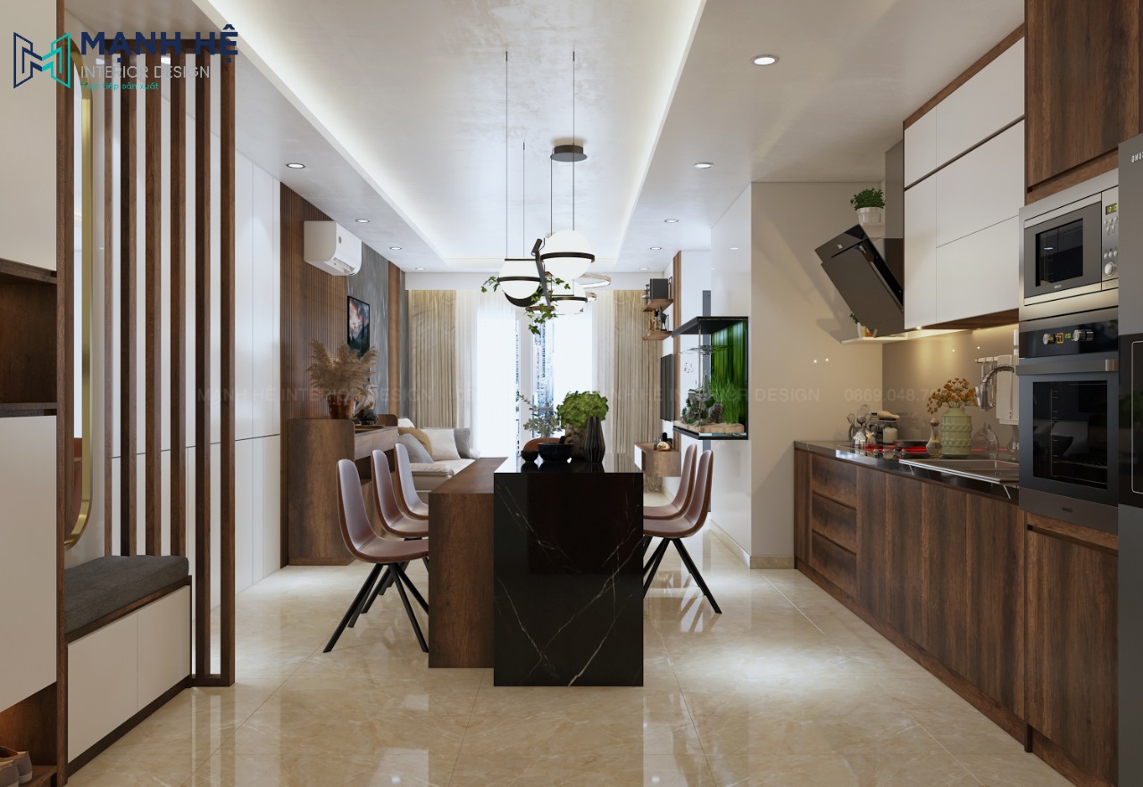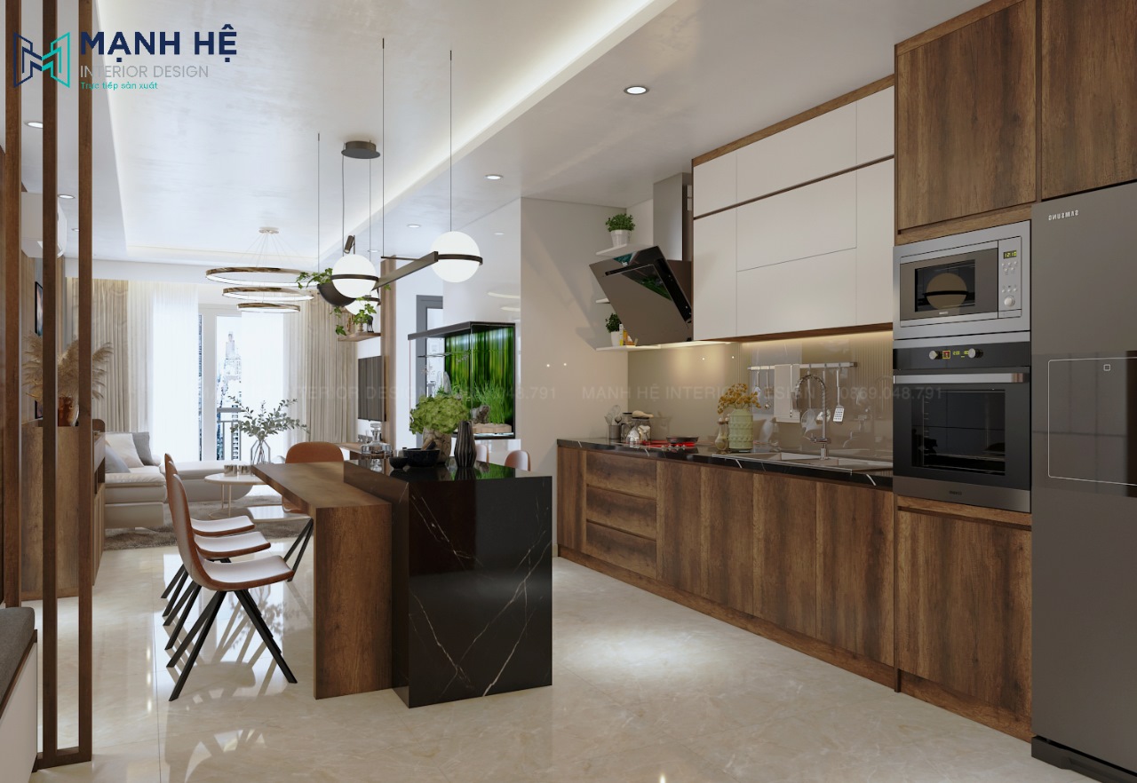 Nhằm tối ưu diện tích căn hộ chung cư có diện tích nhỏ cũng như tận dụng nguồn ánh sáng tự nhiên, Nội thất Mạnh Hệ đã thiết kế không gian phòng khách – phòng bếp liên thông quen thuộc. Tuy nhiên mỗi không gian đều có điểm nhấn riêng đặc biệt. Tạo được nét riêng thể hiện sự tinh tế của gia chủ.