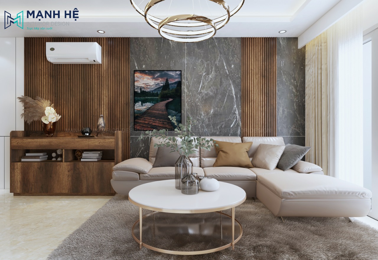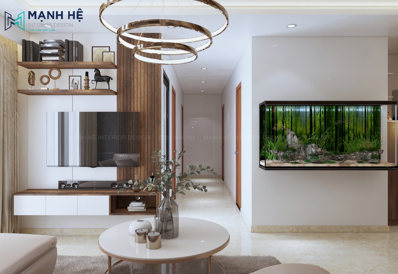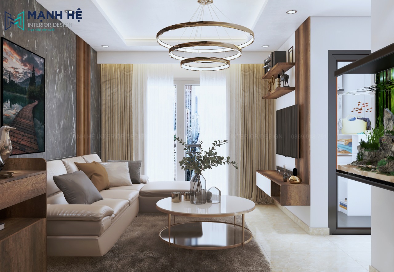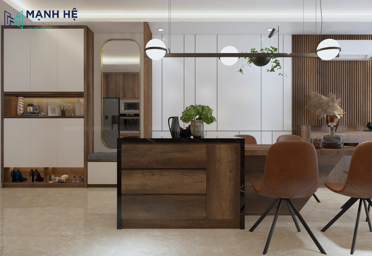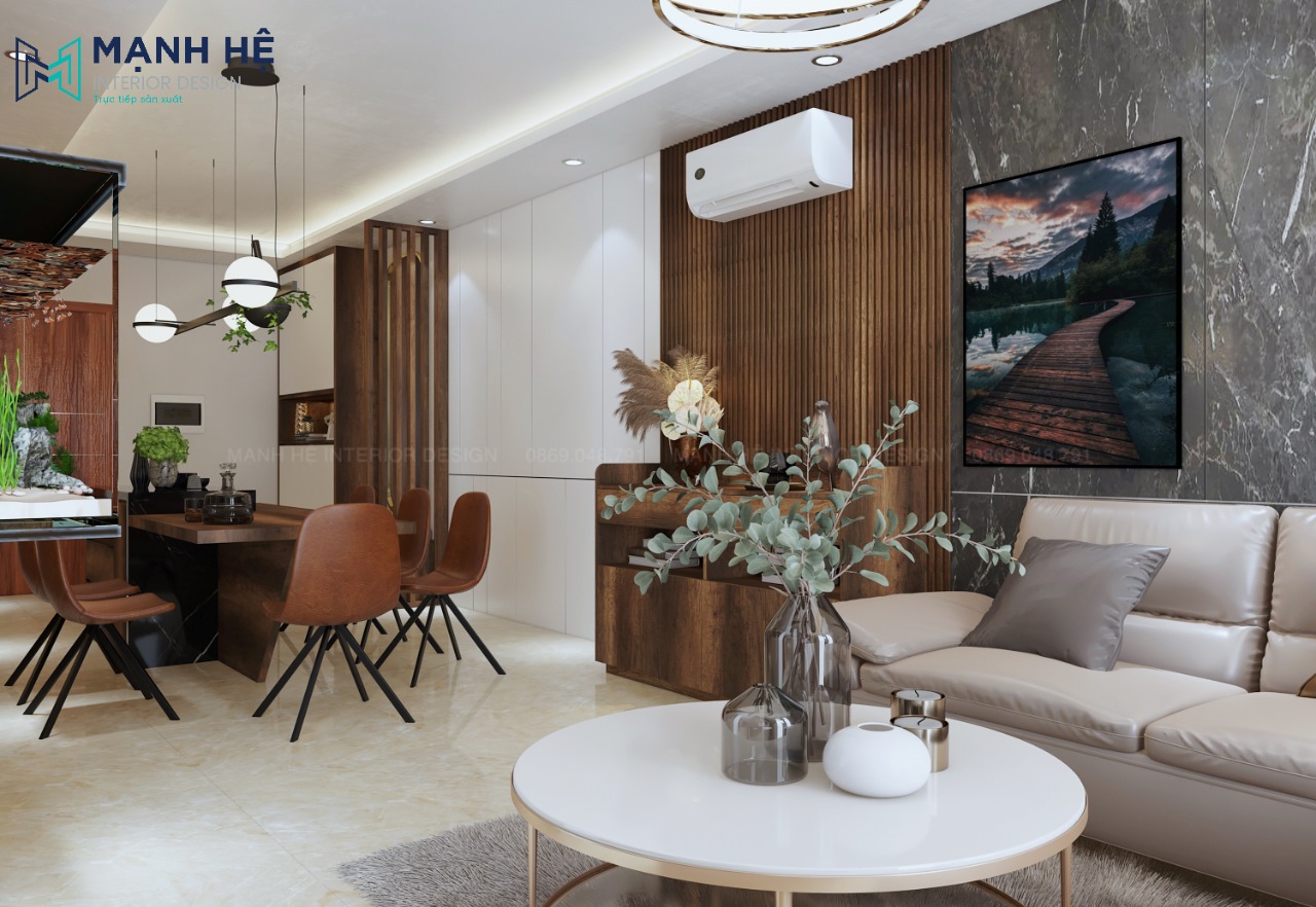 Nhằm tối ưu diện tích căn hộ chung cư có diện tích nhỏ cũng như tận dụng nguồn ánh sáng tự nhiên, Nội thất Mạnh Hệ đã thiết kế không gian phòng khách – phòng bếp liên thông quen thuộc. Tuy nhiên mỗi không gian đều có điểm nhấn riêng đặc biệt. Tạo được nét riêng thể hiện sự tinh tế của gia chủ.