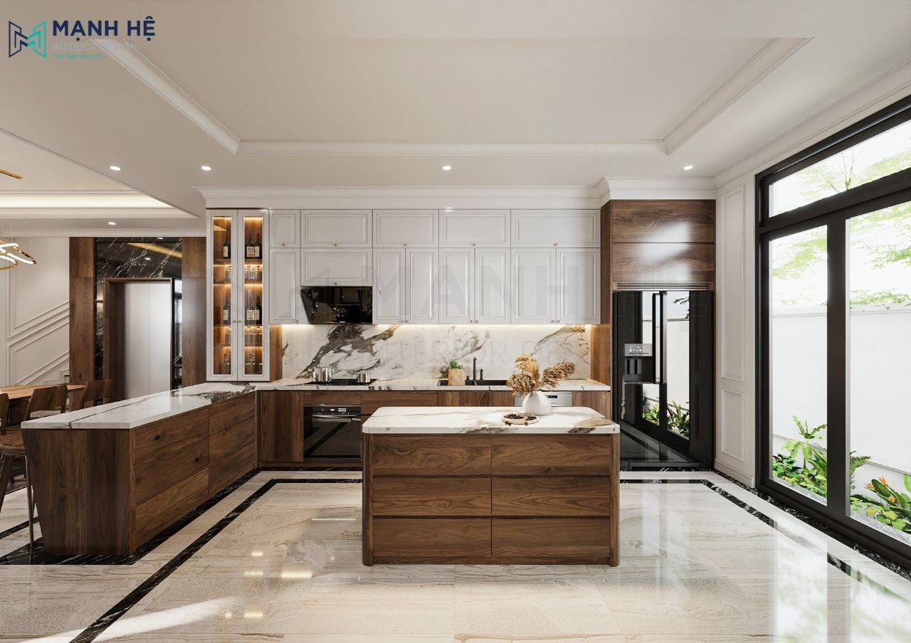 Không gian phòng bếp sáng sủa, gọn gàng, ấm cúng với gam màu trắng nền nã kết hợp hài hòa cùng màu nâu ấm của gỗ tự nhiên. Bố trí bàn đảo bếp chính giữa giúp tăng thêm không gian lưu trữ, tiện lợi khi sử dụng bếp đồng thời giúp tạo điểm nhấn độc đáo cho căn phòng. Hệ tủ bếp dạng chữ L đụng trần sang trọng giúp tiết kiệm diện tích không gian cho gia chủ.
