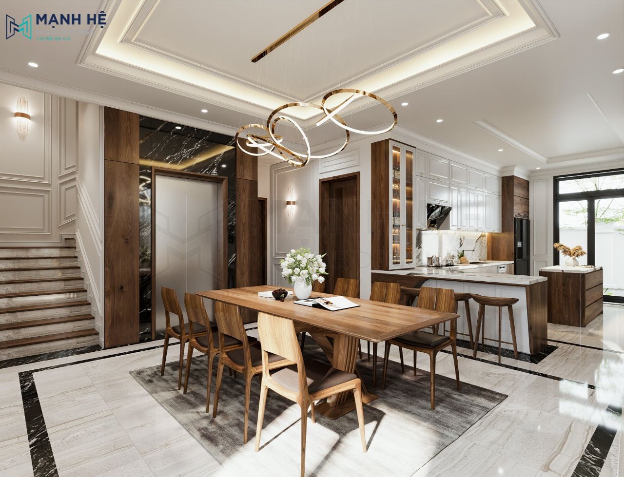 Không gian bàn ăn ấm áp với nội thất bằng gỗ tự nhiên sang trọng kết hợp cùng ánh đèn hiện đại. Thiết kế tủ rượu và quầy bar tích hợp trong gian bếp đậm chất cao cấp, sang trọng theo phong cách thiết kế tối giản, hiện đại.