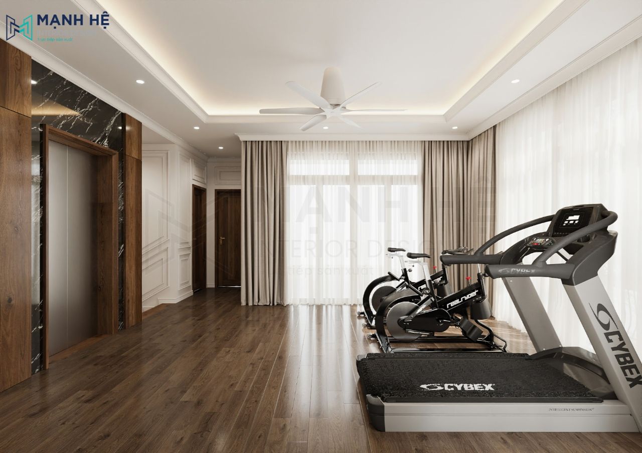 Không gian phòng gym rộng rãi, thoáng đãng giúp gia chủ có thể tận hưởng không gian và đem lại nhiều năng lượng để rèn luyện sức khỏe. Gia chủ có thể vừa tập vừa thư giãn đầu óc khi kết hợp với âm nhạc phù hợp.