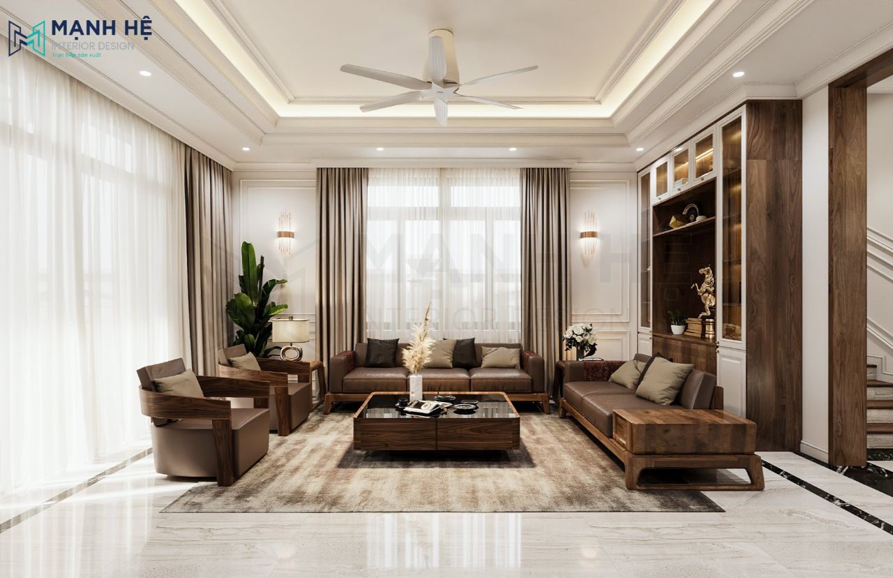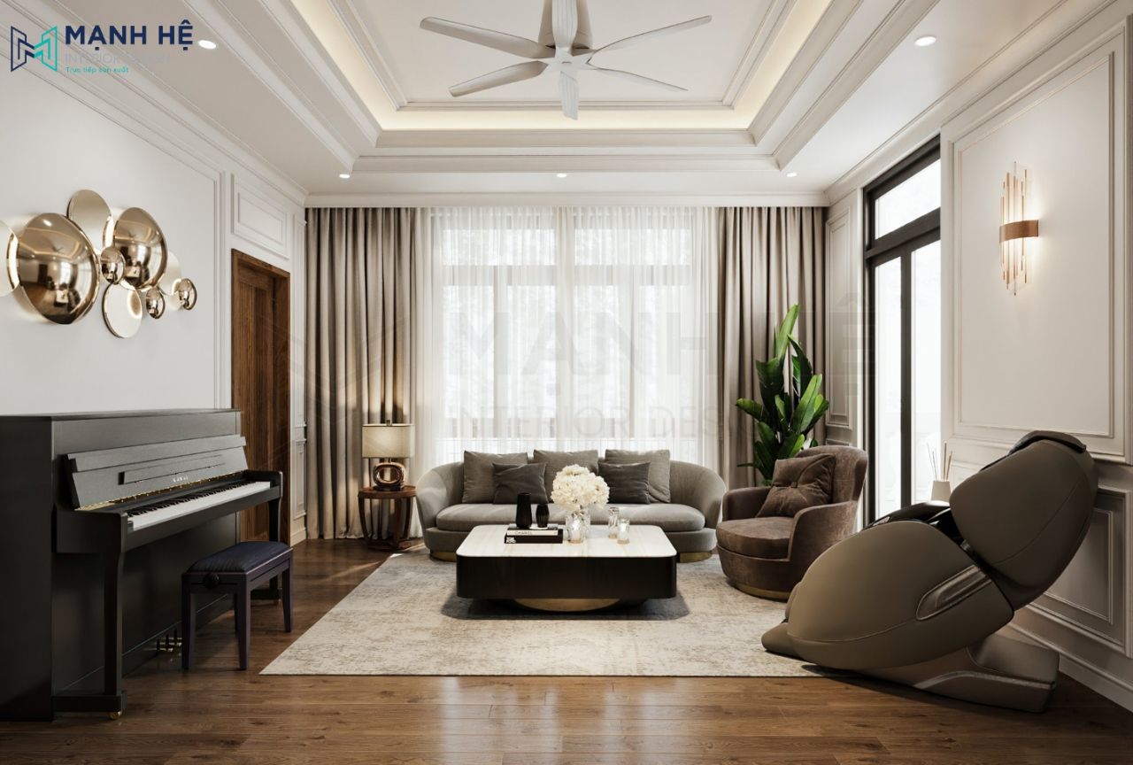 Không gian phòng sinh hoạt chung thoáng đãng với nhiều cửa lớn đón ánh nắng mặt trời. Phong cách thiết kế sang trọng, hiện đại với tone màu lạnh, xám, nâu nhạt tạo cảm giác gần gũi, bình yên. Màu sắc nội thất kết hợp hài hòa với nhau tạo nên không gian thư giãn, giải trí tuyệt vời.