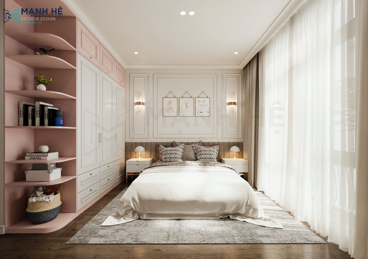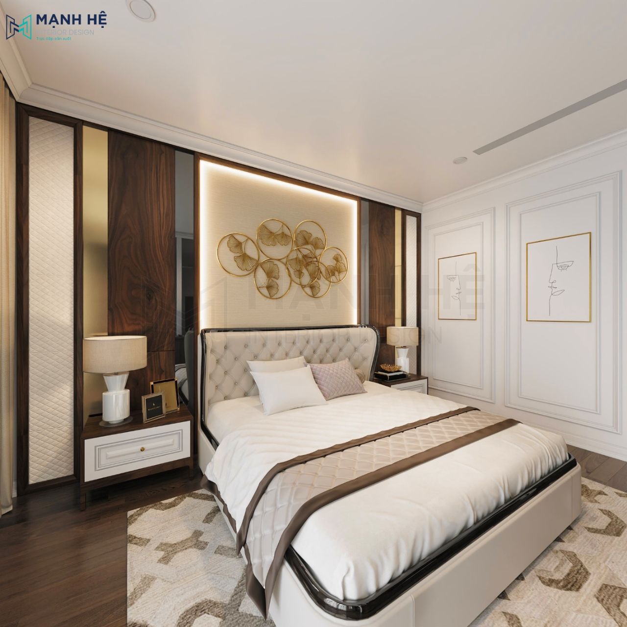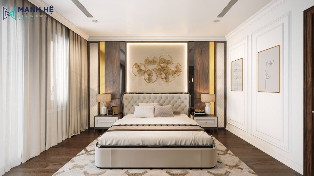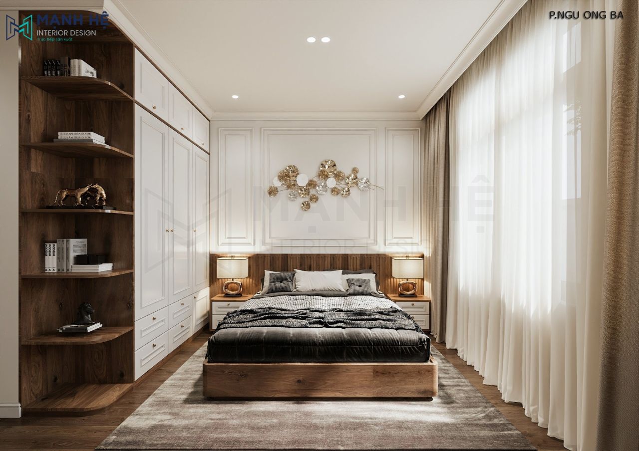 Không gian phòng ngủ với tone màu trắng nền nã làm chủ đạo tạo sự nhã nhặn, thanh lịch, sang trọng. Kết hợp màu sắc của từng chi tiết hài hòa với nhau tạo nên không gian lãng mạn, thư giãn tuyệt vời. Bố trí giường ngủ lớn theo phong cách tân cổ điển cao cấp, sang trọng góp phần tạo giấc ngủ ngon giấc cho gia chủ.