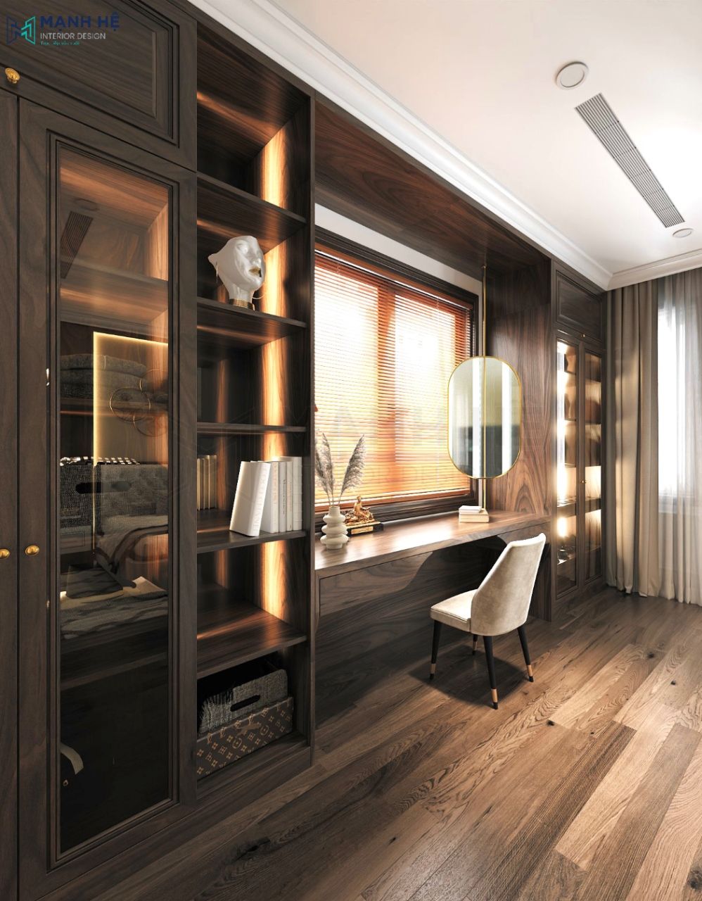 Tủ trang trí với gam màu nâu sẫm gây ấn tượng mạnh cho người nhìn với vẻ đẹp thu hút, sang trọng. Thiết kế cánh mở tiện lợi giúp gia chủ dễ dàng sắp xếp đồ đạc và trang trí. Bàn trang điểm đơn giản. nhỏ gọn phù hợp với không gian kết hợp cùng cửa sổ lớn mang lại ánh sáng tự nhiên vào phòng.