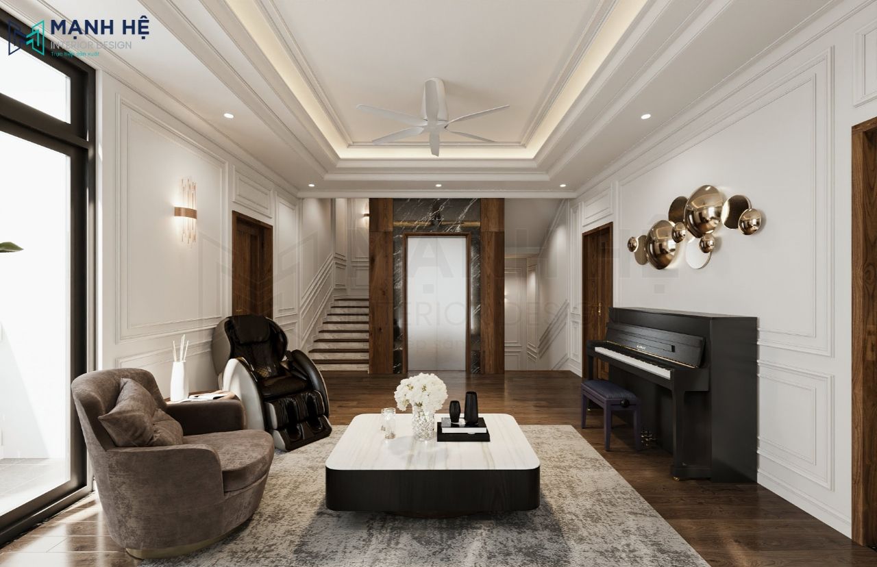 Bố trí đàn piano màu đen góp phần tôn lên vẻ sang trọng, đẳng cấp, đồng thời giúp gia chủ thể hiện đam mê âm nhạc với tiếng đàn du dương. Bên trên piano trang trí những hình tròn vàng đồng tạo thành hình cá voi độc đáo, vẻ đẹp nghệ thuật cao.