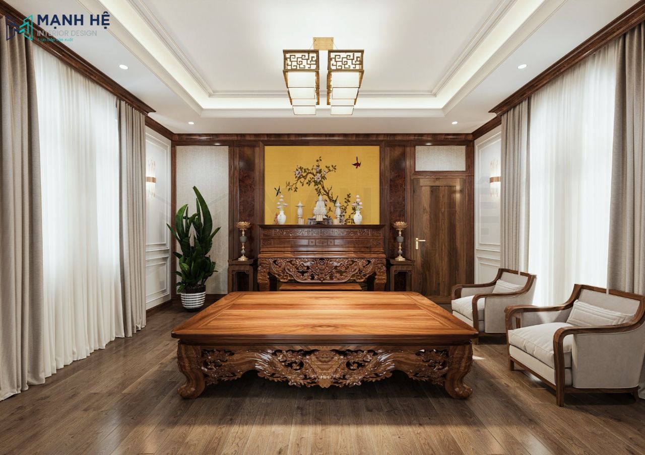 Phản gỗ với hoa văn thiết kế tinh xảo, cầu kì tạo vẻ đẹp sang trọng, đẳng cấp của gia chủ. Bố trí thêm hệ thống đèn led, tranh ảnh giúp tạo sự sinh động, điểm nhấn cho căn phòng. Bố trí nhiều cửa sổ cùng rèm cửa 2 lớp giúp thông thoáng, tận dụng ánh sáng vào phòng.