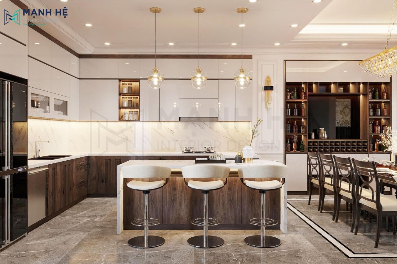Thiết kế nội thất không gian phòng bếp sang trọng, tiện nghi với gam màu trắng trang nhã kết hợp hài hòa cùng nội thất gỗ và hệ thống đèn thả trần hiện đại. Thiết kế bàn đảo bếp mặt đá marble cao cấp tăng thêm tính thẩm mỹ cho toàn bộ không gian.