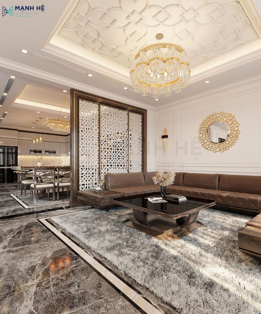 Nội thất phòng khách được thiết kế theo phong cách hiện đại, sang trọng với gam màu trắng kết hợp cùng nội thất màu nâu làm chủ đạo độc đáo thu hút mọi ánh nhìn của những vị khách đến chơi nhà. Đèn thả trần với thiết kế tinh tế, sang trọng tôn lên vẻ đẹp của phong cách tân cổ điển.