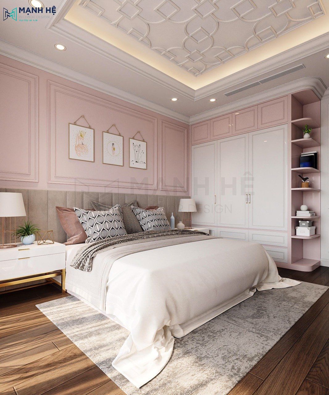 Tủ quần áo kết hợp kệ trang trí với thiết kế cao đụng trần tiết kiệm diện tích không gian, tăng không gian lưu trữ đồ đạc cho gia chủ với màu hồng ngọt ngào và màu trắng là chủ đạo. Bên cạnh đó, sử dụng sàn gỗ cao cấp giúp gia tăng thẩm mỹ cho không gian phòng ngủ.
