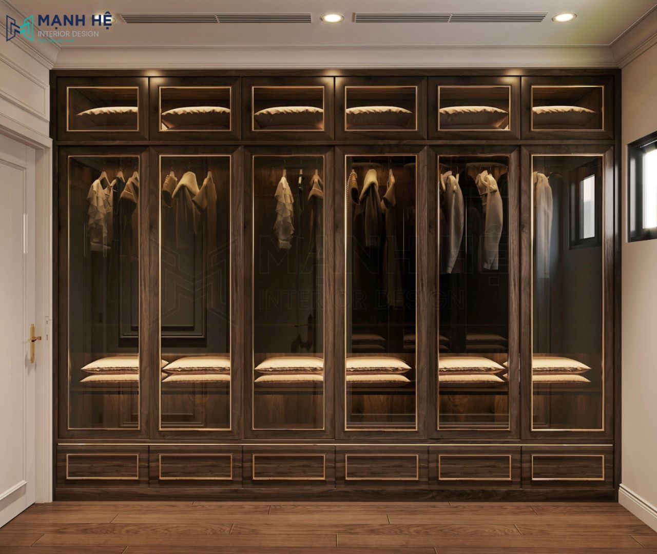 Tủ quần áo cao đụng trần được làm từ gỗ cao cấp với vân gỗ tinh tế kết hợp cửa kính giúp Gia chủ có thể khoe trọn những bộ cánh độc đáo. Bên cạnh đó, chạy hệ thống đèn led vàng gia tăng thêm sự sang trọng, quý phái cho toàn bộ không gian.