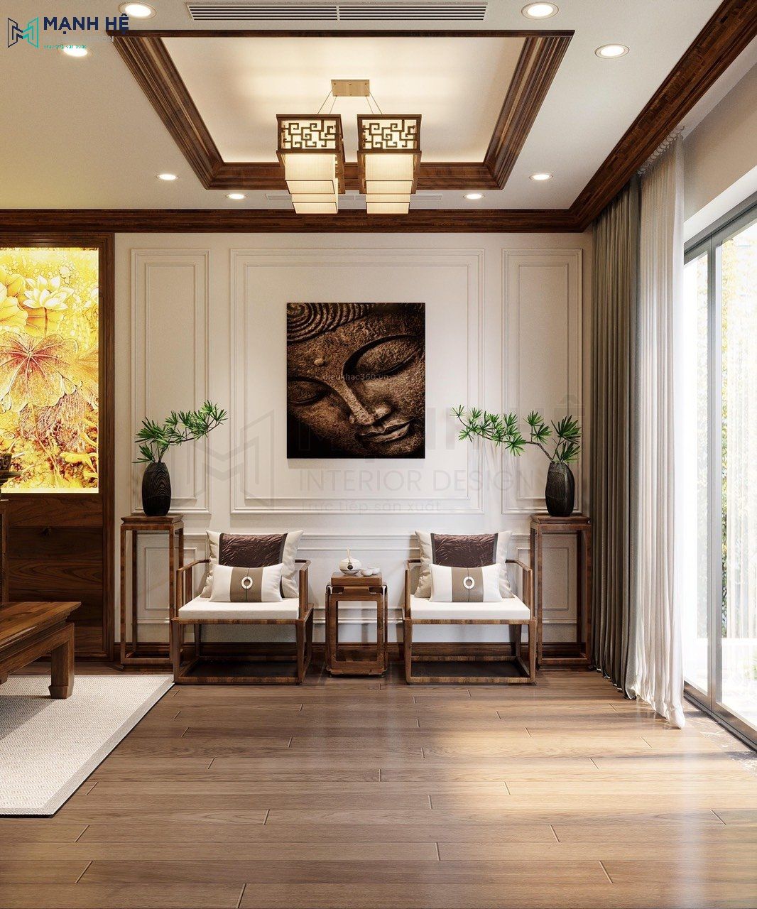 Trang trí thêm tứ bình tranh tạo cảm giác quen thuộc, gần gũi của thời xưa. Tổng thể không gian phòng thờ trang nghiêm, tĩnh mịch đúng với yêu cầu của Gia chủ.