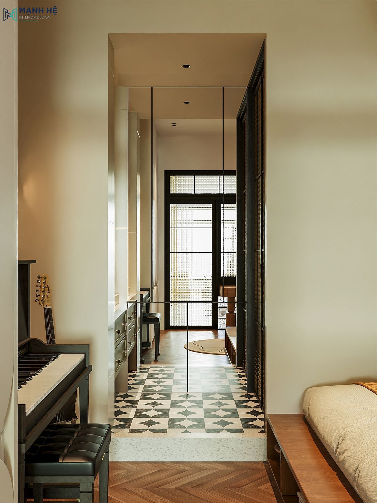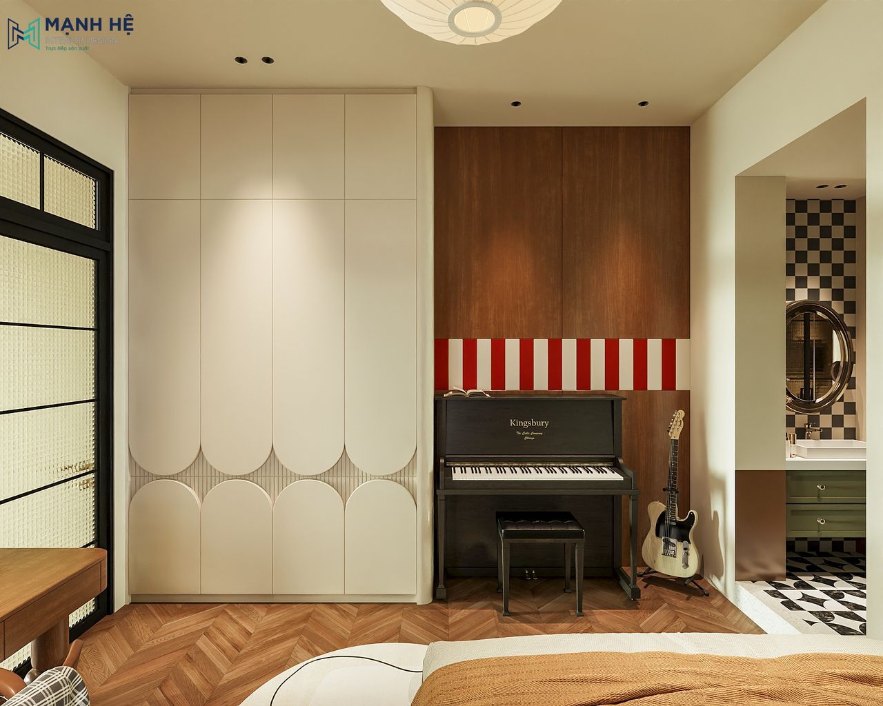 - Điểm nhấn độc đáo đến từ khu vực bố trí đàn piano và guitar, gợi nên không gian sống tràn đầy cảm hứng nghệ thuật.