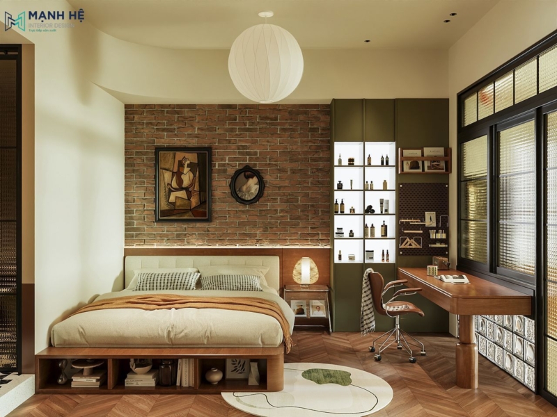 - Căn phòng sử dụng nội thất gỗ công nghiệp chủ đạo nổi bật với mảng tường gạch thô mộc mạc, mang lại cảm giác gần gũi và giàu tính thẩm mỹ.