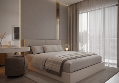 - Mảng tường đầu giường ốp nỉ xám phối chi tiết ánh kim tạo điểm nhấn sang trọng và chiều sâu cho không gian.