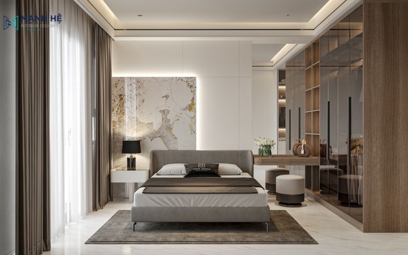 - Bố cục phòng ngủ được sắp xếp khoa học với cách phân chia khu vực nghỉ ngơi, thay đồ và bàn làm việc vô cùng tiện nghi.