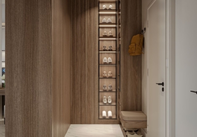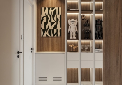 - Các kệ mở kết hợp tủ lưu trữ nhỏ được bố trí ngay tại cửa vào để trưng bày mô hình, sách và vật phẩm cá nhân, thể hiện cá tính riêng của gia chủ.