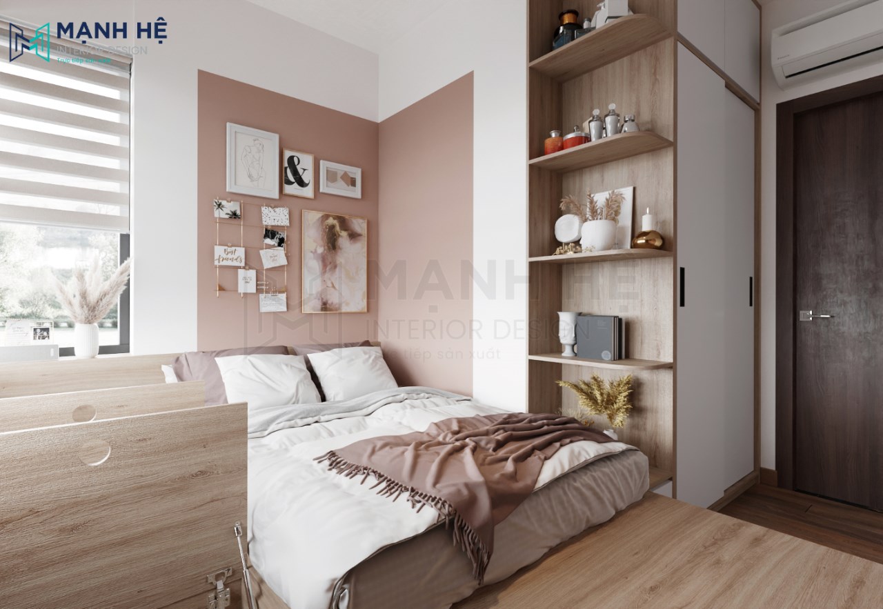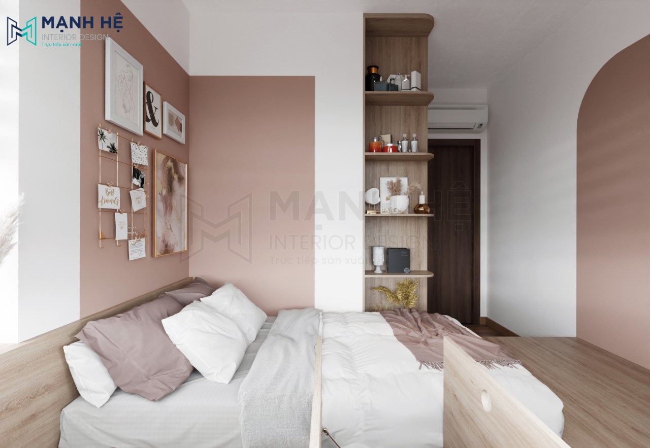 Các mảng tường trong phòng ngủ được sơn màu hồng đất nhã nhặn