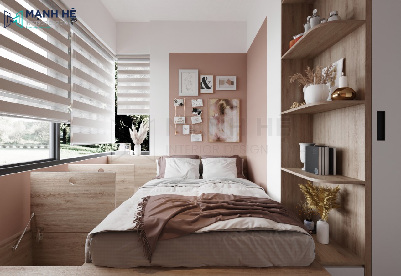 Phòng ngủ này được thiết kế dành cho gia chủ nữ với nhấn tường gam màu hồng sẫm. Bố trí bục giường ngủ thông minh với các ngăn hộc để đồ đa năng. Thiết kế hệ cửa kính tạo không gian thoáng đãng, thoải mái cho gia chủ.