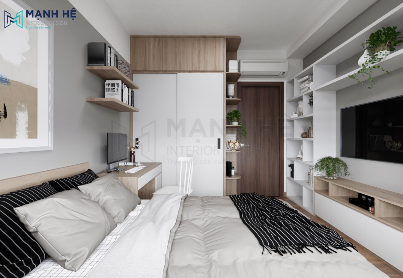 Thiết kế tủ quần áo cánh lùa cao đụng trần tích hợp thêm kệ trang trí, bàn làm việc với kệ sách treo tường tiện nghi. Tủ sách lớn kết hợp kệ tivi ở cuối giường.
