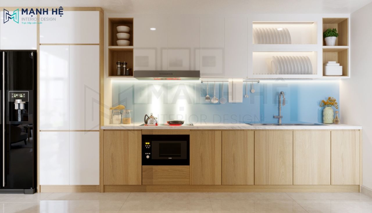 Tuy khu vực nhà bếp nhỏ, nhưng với hệ tủ bếp chữ I đơn giản, cao đụng trần, cùng cách phối màu trắng trung tính với màu vàng gỗ sáng đã làm căn bếp như được mở rộng thêm một chút.