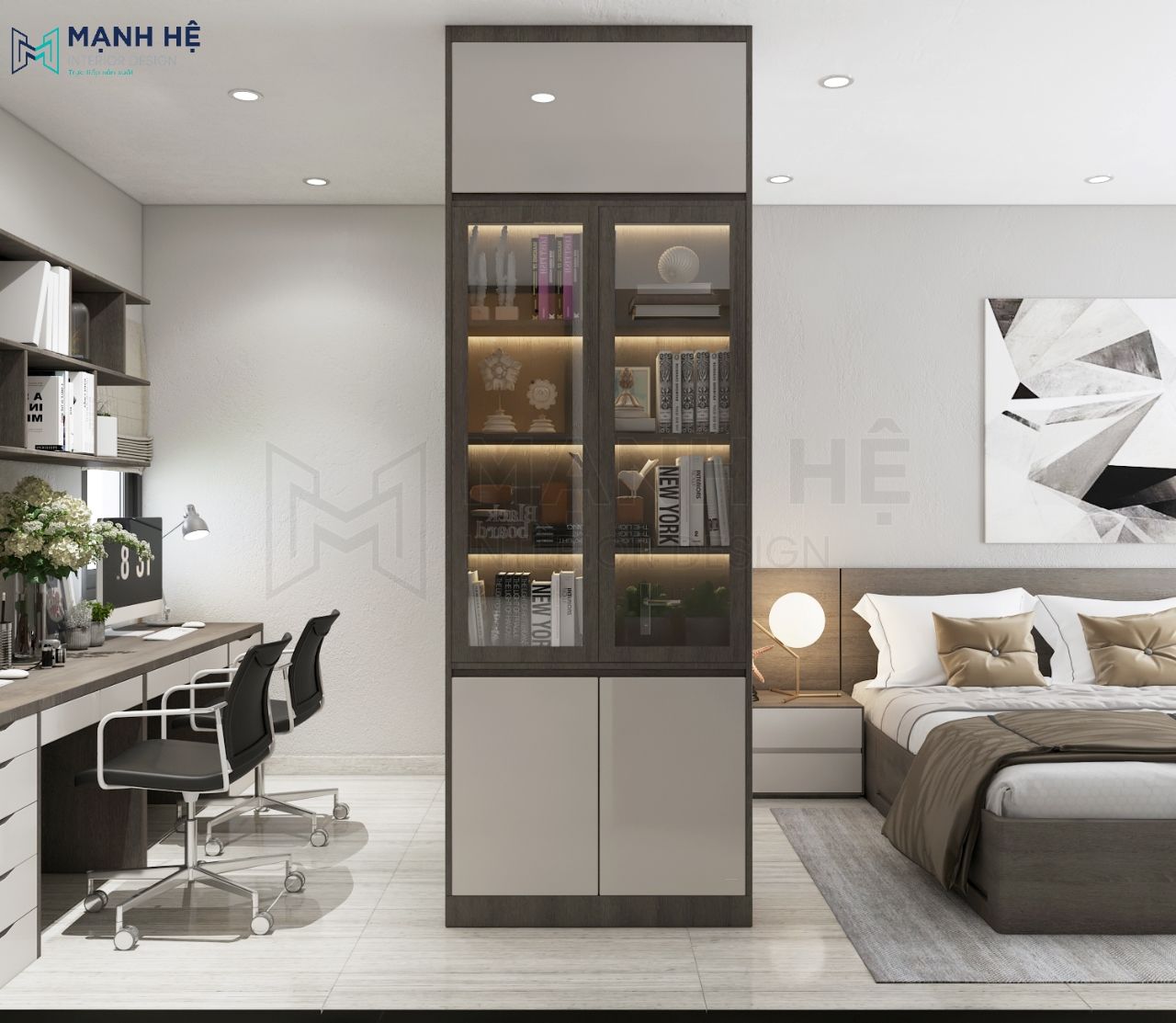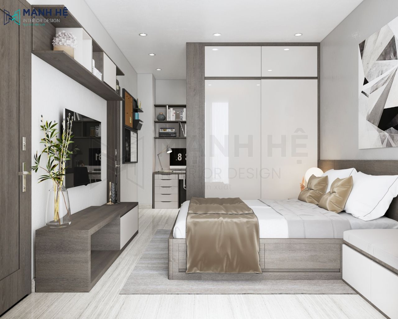 Giường ngủ, bàn làm việc, tủ quần áo được đặt liên tiếp nhau tạo nên sự xuyên suốt, liền mạch cho không gian phòng ngủ nhỏ có cảm giác được nới rộng hơn với nhiều khoảng trống.