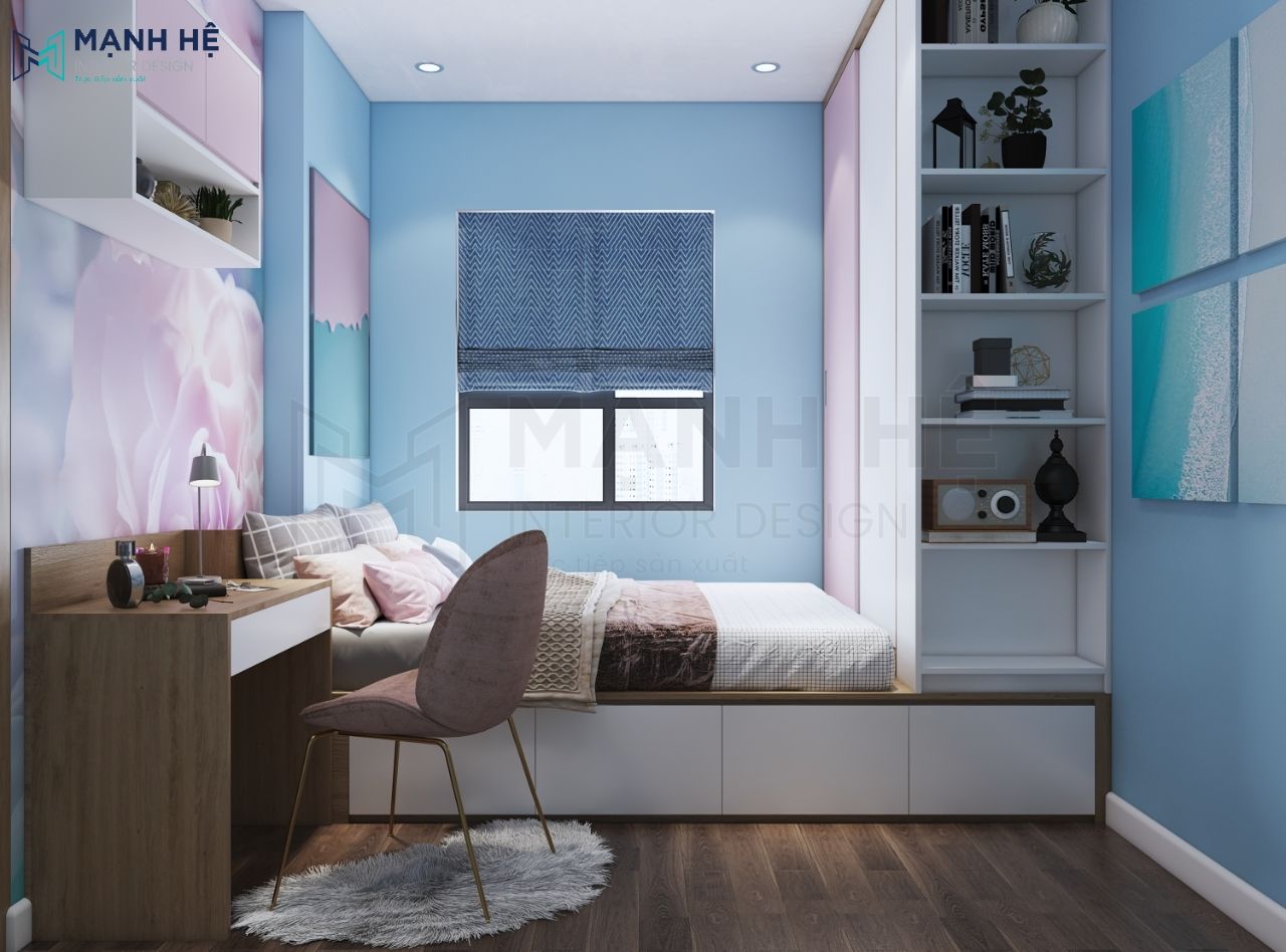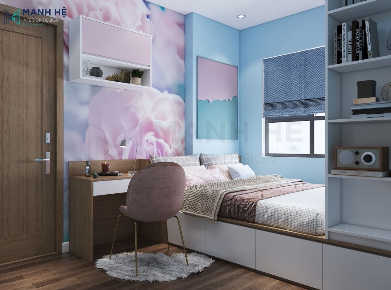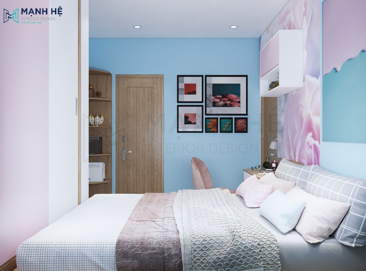 Chọn gam màu hồng nhạt ngọt ngào, pha lẫn màu xanh biển mộng mơ làm 2 gam màu chính trong phòng ngủ con gái. Hơn thế nữa, bộ giấy dán tường 3D trang trí càng kích thích khả năng sáng tạo hơn cho bé.