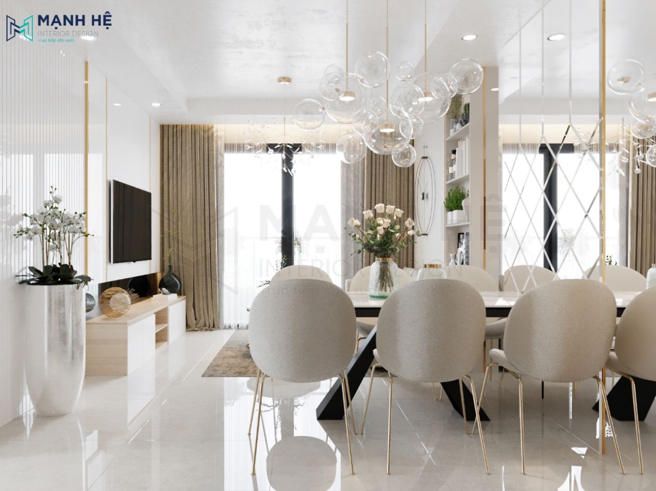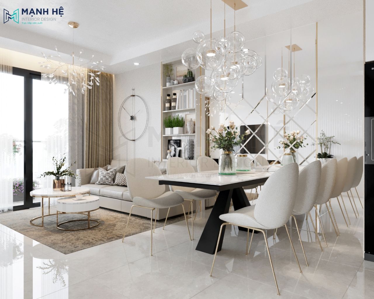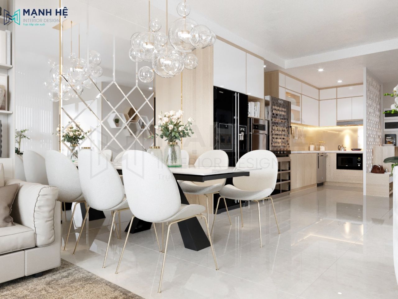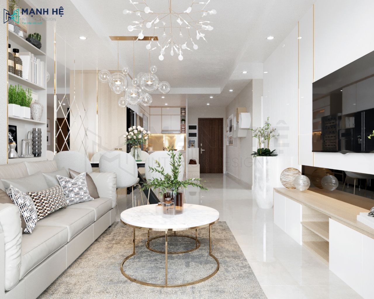 Phá vỡ giới hạn, tự do thể hiện sở thích và phong cách riêng của bạn là những gì được thể hiện trong bản thiết kế nội thất căn hộ chung cư Gold View của gia đình chị Thủy. Với gam màu trắng chủ đạo sẽ làm không gian trở nên tinh tế hơn, nhưng sẽ có cảm giác hơi lạnh một chút. Chính vì vậy, các chuyên gia thiết kế Mạnh Hệ đã điểm thêm những gam màu vàng gỗ ấm áp, tạo sự cân bằng nhiệt độ cho tổ ấm gia đình.