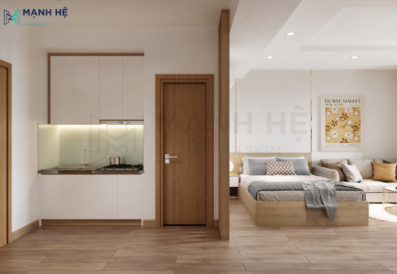 Căn hộ studio được kết hợp bởi phòng khách, phòng bếp và phòng ngủ liền nhau tạo không gian rộng hơn, hiệu quả hơn cho diện tích khiêm tốn mà vẫn đảm bảo đầy đủ tiện nghi. Không gian được thiết kế theo phong cách hiện đại với màu sắc trầm ấm, nhẹ nhàng mang cảm giác thư giãn và ấm áp.