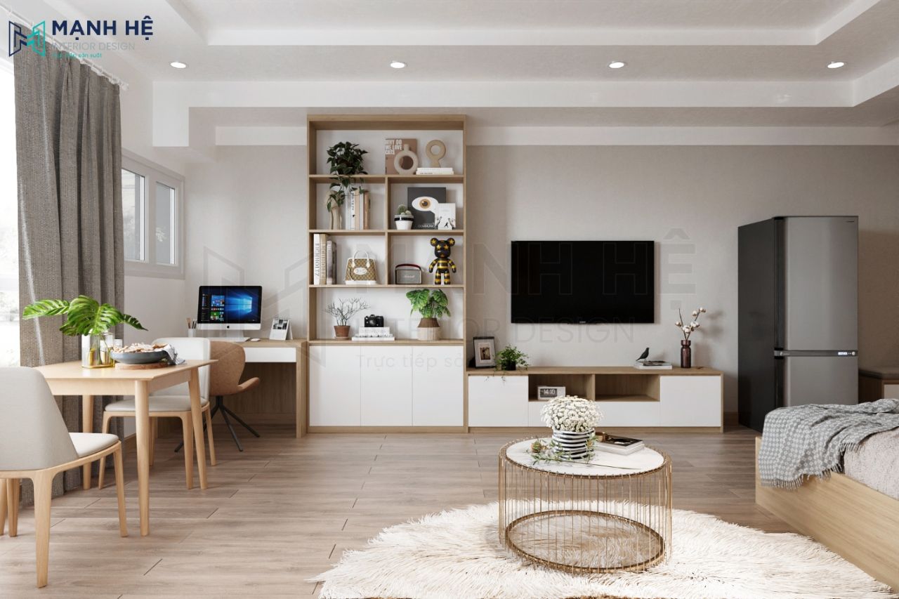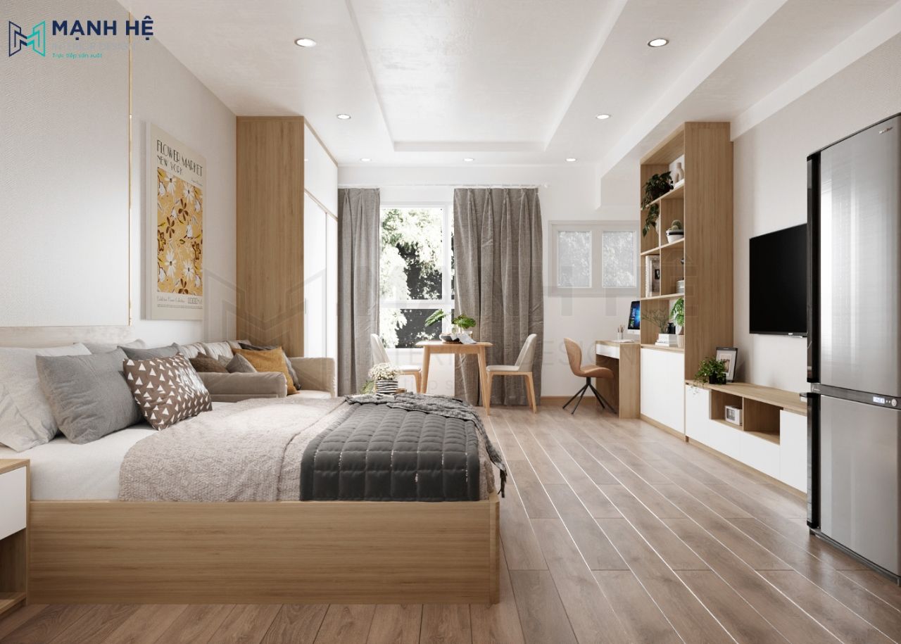 Thiết kế phòng khách liền phòng ngủ với tone màu trầm ấm, nhẹ nhàng