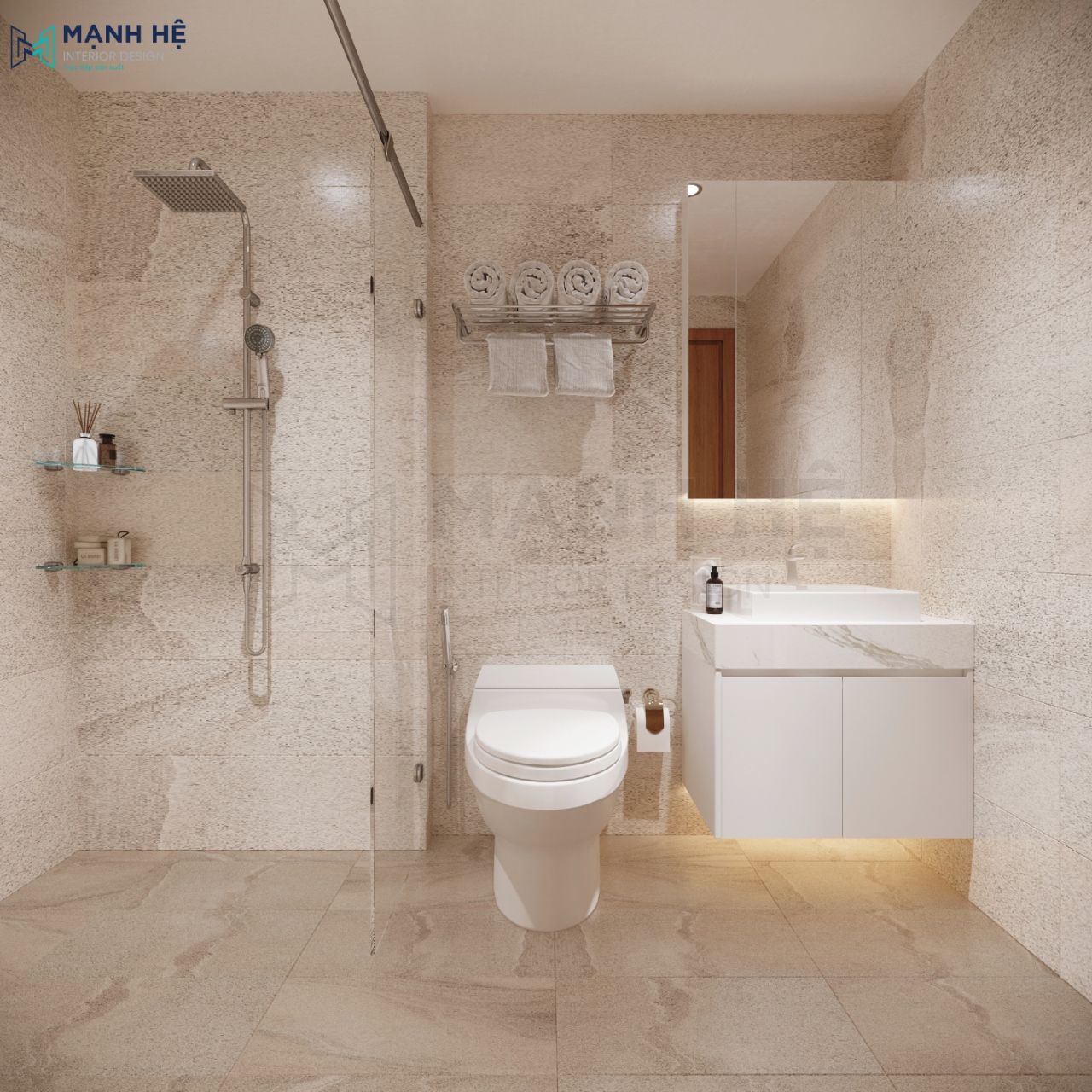 Toilet được lát gạch với gam màu sáng giúp căn phòng thêm sạch sẽ, gọn gàng