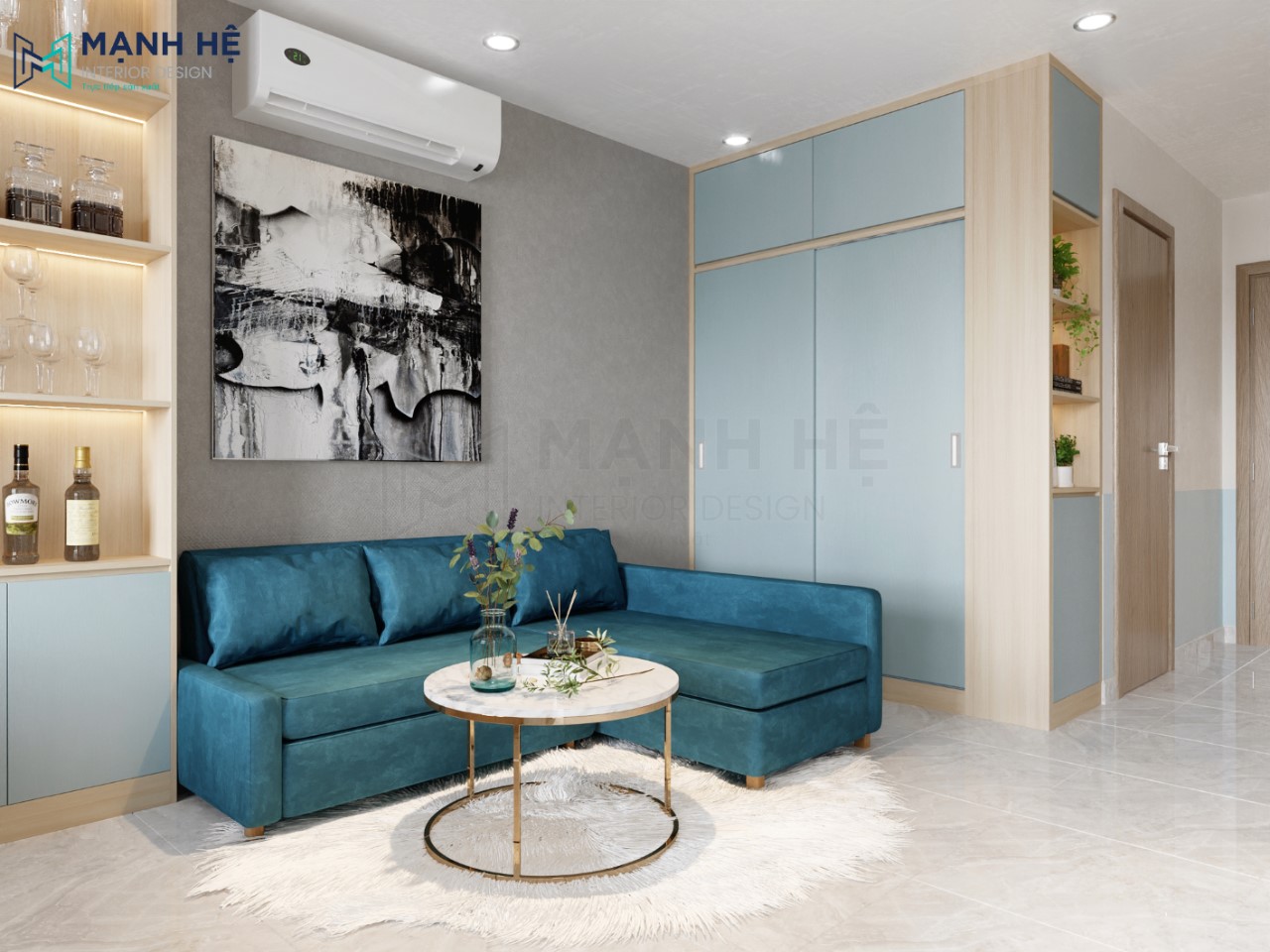 Không gian phòng khách với điểm nhấn ghế sofa đệm màu xanh nổi bật kết hợp bàn trà nhỏ và thảm lông trắng. Màu sắc độc đáo thể hiện đúng tính cách và sở thích của gia chủ. Bên cạnh đó, Gia chủ sử dụng tủ quần áo màu xanh nhạt hơn màu sofa với thiết kế âm tường, 2 buồng tương đương 2 cánh mở giúp tiết kiệm diện tích nhưng vẫn đảm bảo mỹ quan đối với tổng thể.