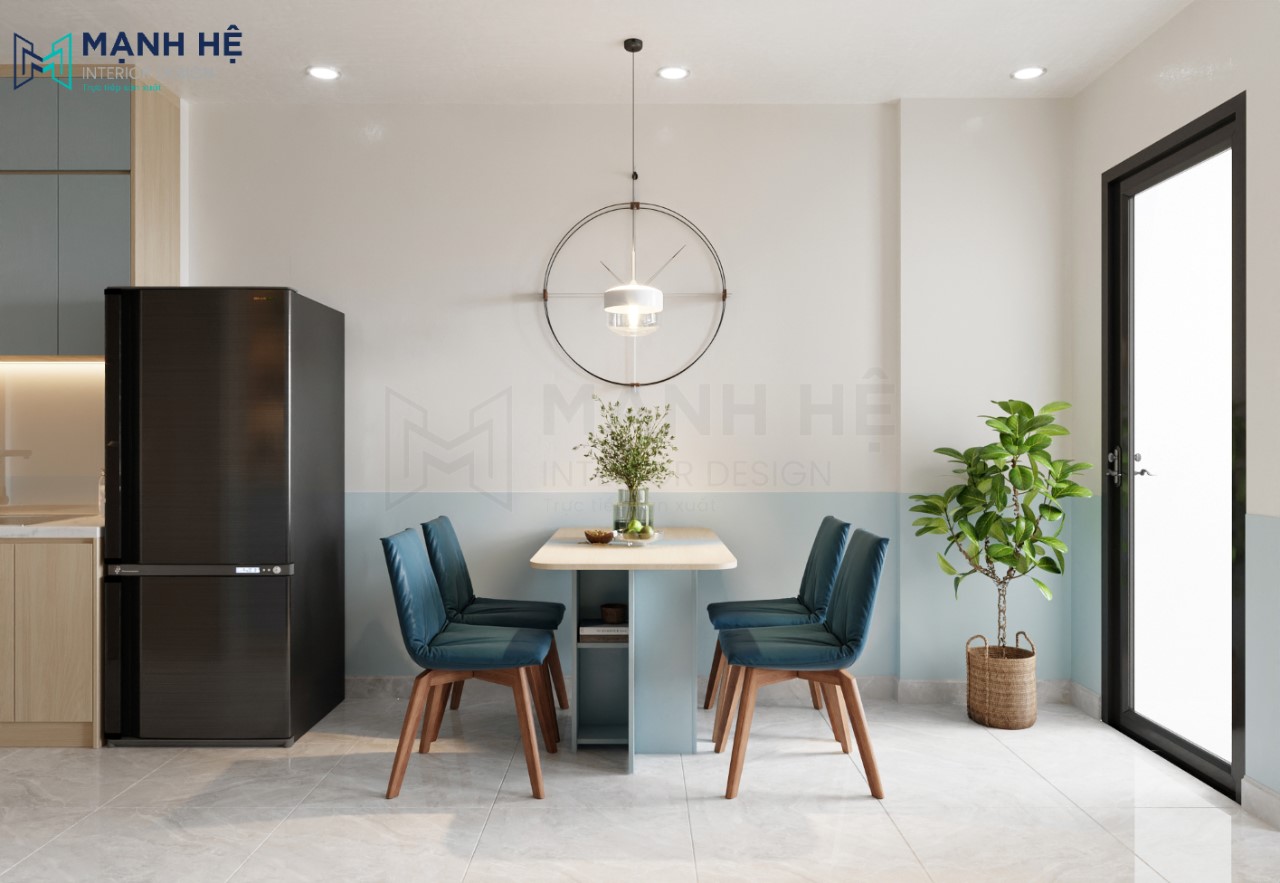 Thiết kế phòng bếp chung cư có hệ tủ bếp chữ I đồng bộ màu chủ đạo căn phòng, với tủ bếp trên màu xanh và tủ bếp dưới màu gỗ nhạt tạo điểm nhấn cho phòng bếp. Thêm bộ bàn ăn 4 ghế nhỏ và tiện nữa là hoàn thành căn hộ studio mơ ước của nhiều người.