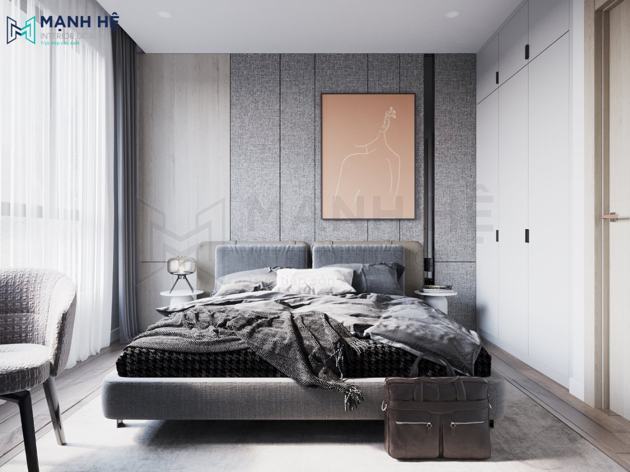 Giường ngủ lớn với tranh treo đầu giường tạo nên tính thẩm mỹ cao với tone màu xám hiện đại, trẻ trung