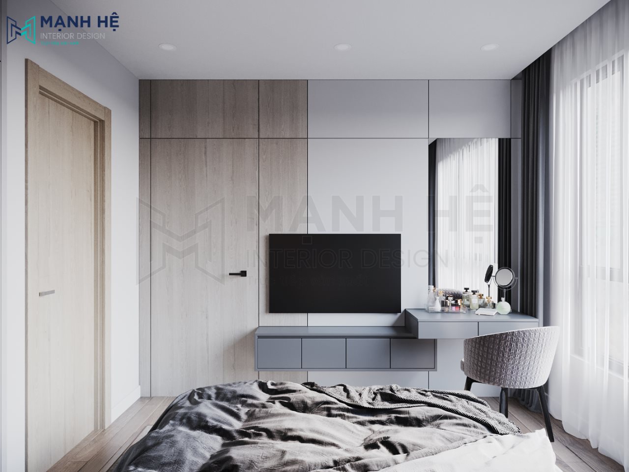 Phòng ngủ gắn kệ chứa đồ rộng rãi và bàn trang điểm kết hợp tủ quần áo âm tường mang vẻ hiện đại, tiện nghi