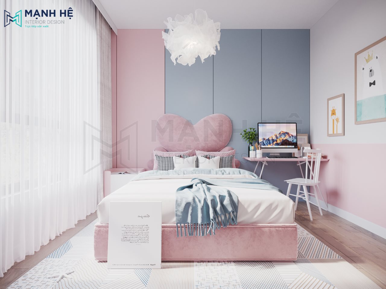 Thiết kế nội thất phòng ngủ bé gái với màu hồng ngọt ngào là gam màu chủ đạo. Bố trí giường ngủ lớn có bọc nhung màu hồng xinh xắn, tối ưu ánh sáng trong phòng nhờ rèm cửa 2 lớp mang đến cảm giác thoải mái, dễ chịu cho bé. Bên cạnh đó, hệ thống đèn trần độc đáo kết hợp cùng thảm trải sàn là điểm nhấn cho tổng thể.