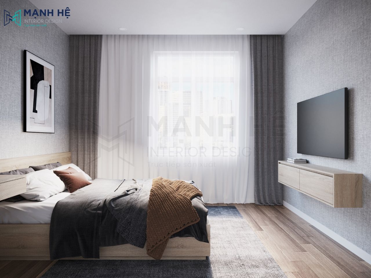 Thảm trải giường với màu xám vừa mang vẻ hiện đại, vừa giúp căn phòng trở nên ấm áp hơn