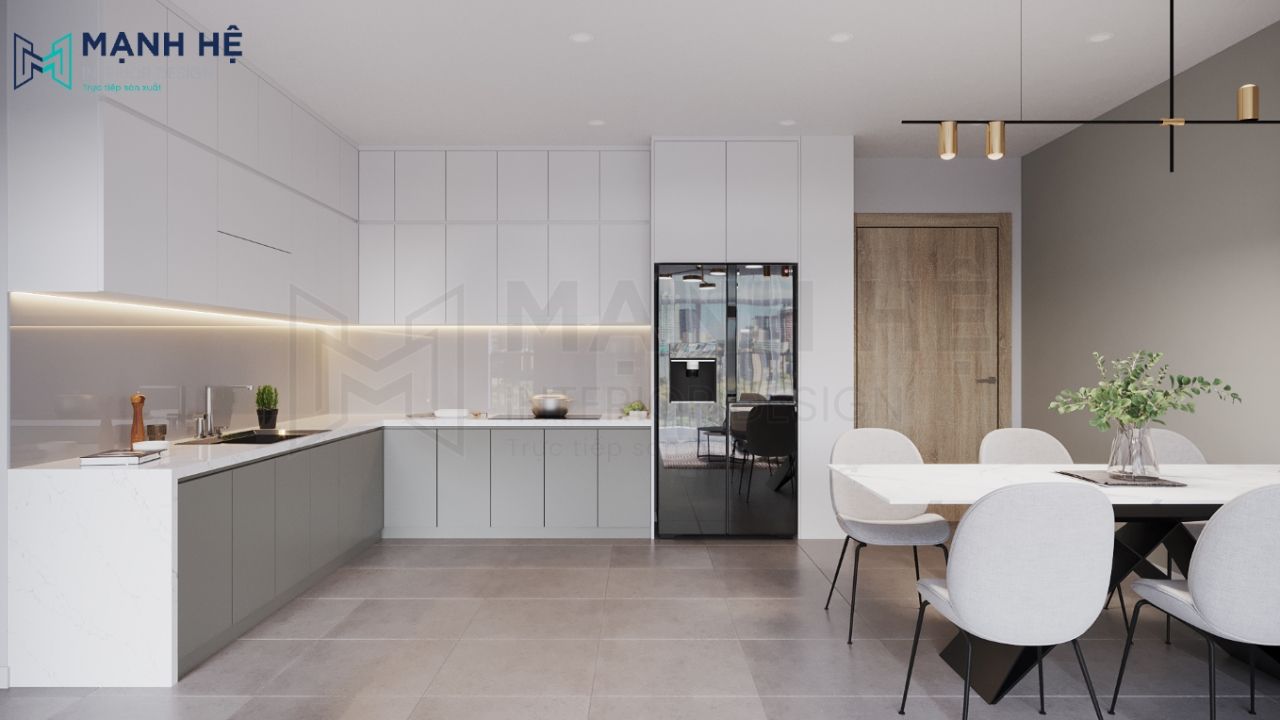 Tủ bếp hình chữ L ôm sát góc tường tận dụng tối đa không gian căn hộ, tủ lạnh hiện đại có kích thước lớn giúp bạn thoải mái chứa thực phẩm