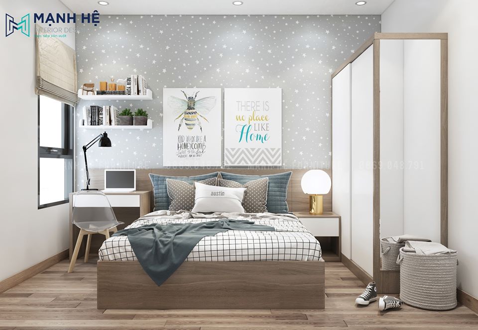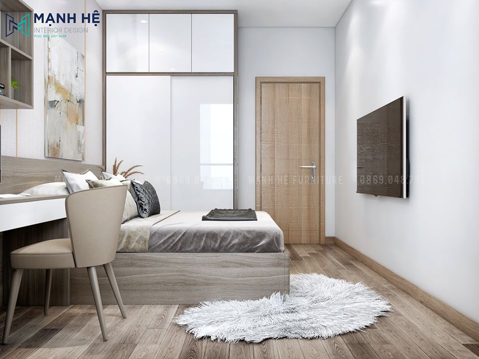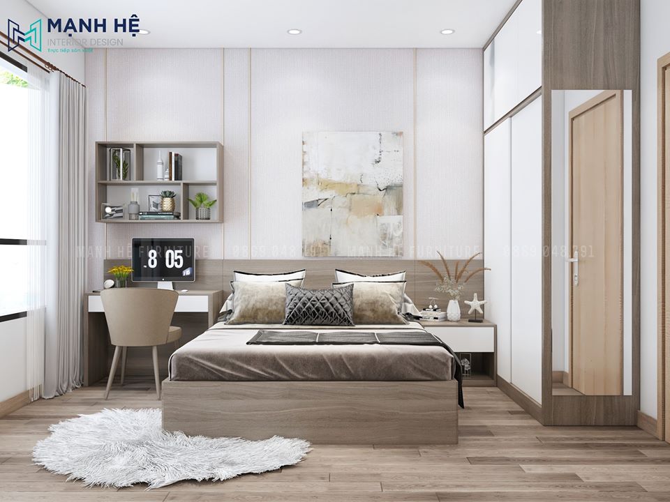 Mạnh Hệ đã lựa chọn chất liệu gỗ công nghiệp cho những đồ nội thất mang màu trắng trong mẫu thiết kế này và đan xen một chút màu vân gỗ để tránh đơn điệu đồng thời giúp căn phòng trông ấm áp hơn.