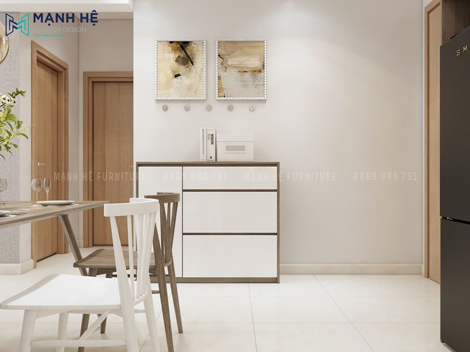 Tủ đựng đồ đặt bên hông cửa ra vào thuận tiện cho mọi người để giày dép, vật dụng thường xuyên sử dụng, nó rất thuận tiện cho việc di chuyển mà không hề chiếm diện tích hay chật chội. Phía bên trên được trang trí 2 khung tranh nghệ thuật với màu sắc tương đồng với căn hộ, tránh sự nhàm chán.