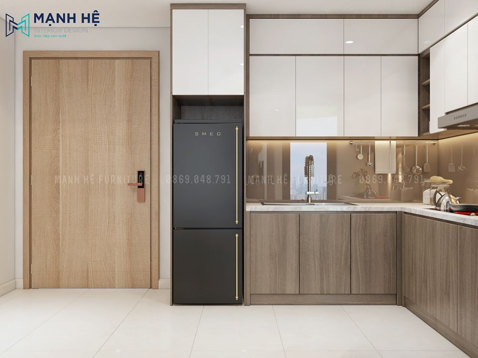 Tủ bếp được thiết kế hình chữ L với phần tủ trên màu trắng, tủ bên dưới màu vân gỗ vừa mang nét đẹp đặc trưng vừa đa chức năng mang đến một không gian hiện đại và tiện nghi cho cả gia đình