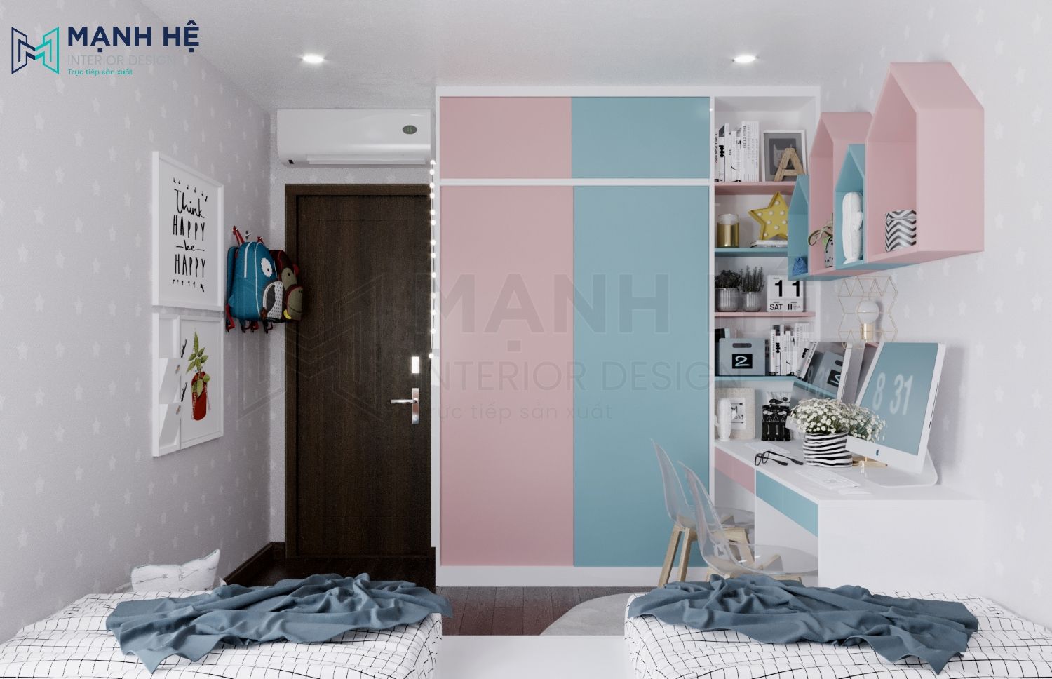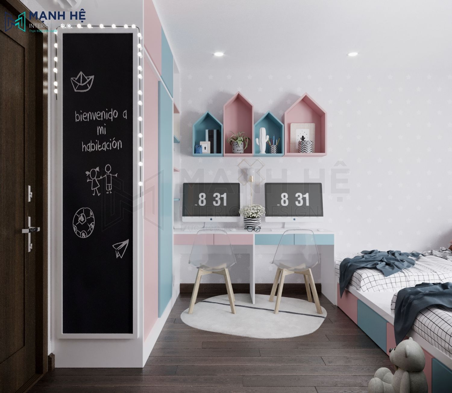 Bàn học và tủ quần áo được chia ra 2 màu riêng biệt cho 2 bé có không gian riêng