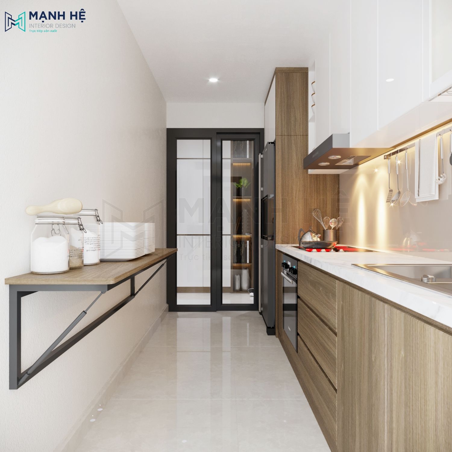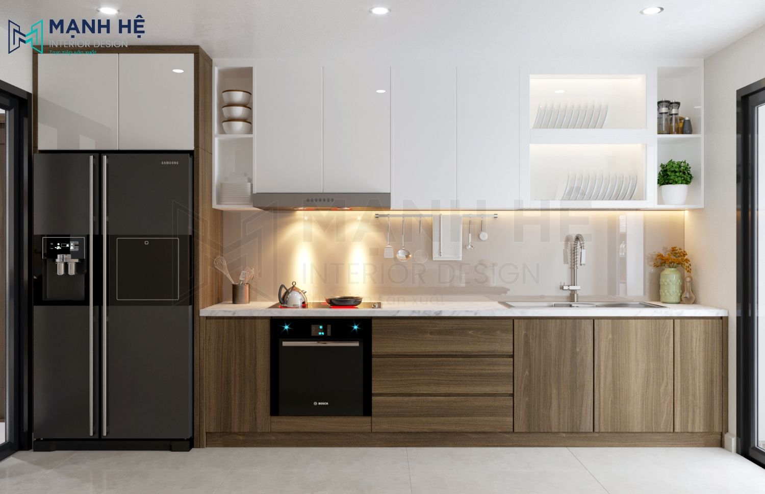 Phòng bếp chung cư được cách biệt riêng một không gian mặc dù với diện tích hạn chế nhưng vẫn giữ được nét tinh tế vốn có nhờ vào hệ thống tủ bếp chữ I làm từ gỗ công nghiệp hiện đại.