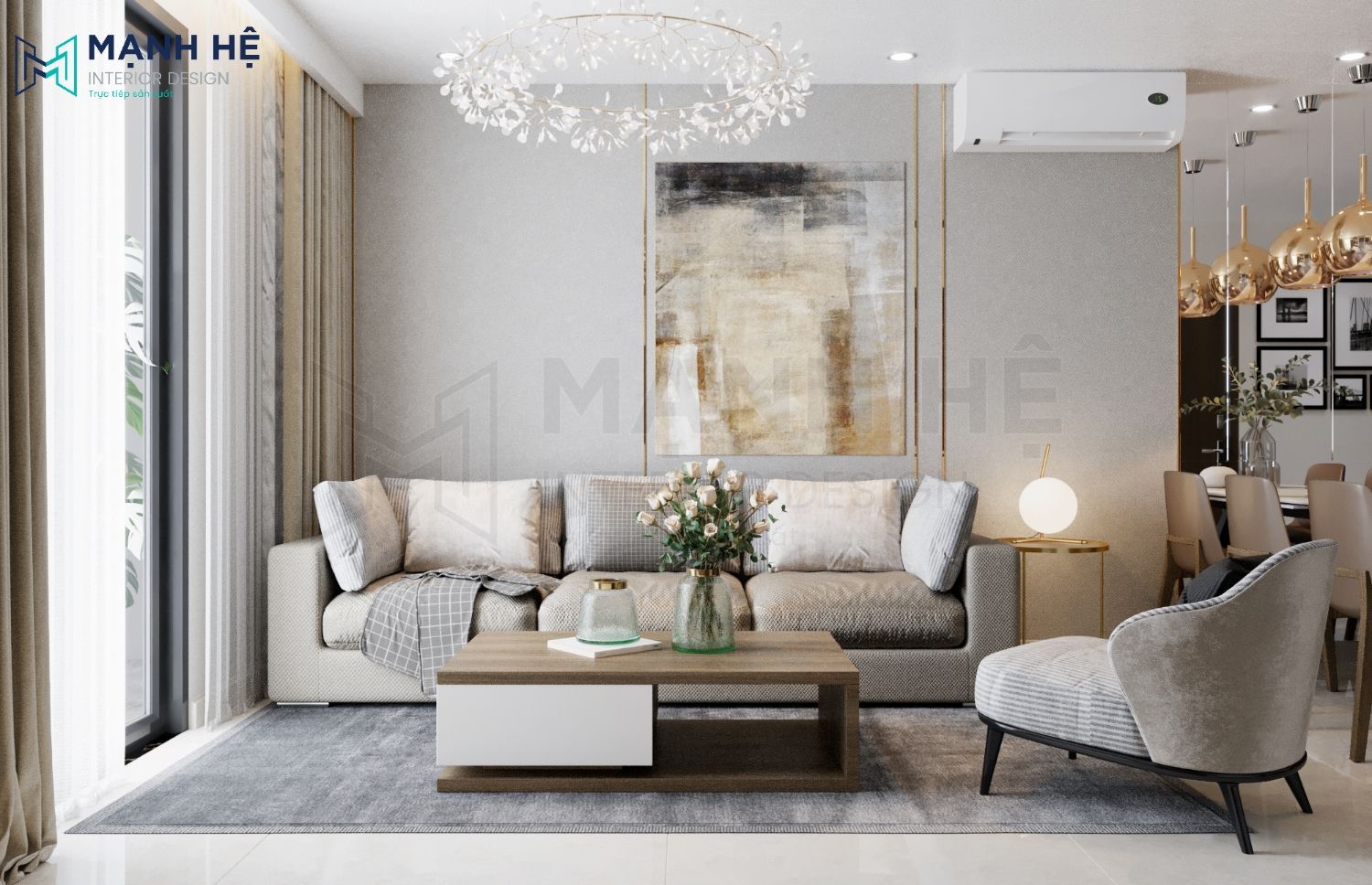Không gian phòng khách được thiết kế với màu sắc trung tính nhã nhặn