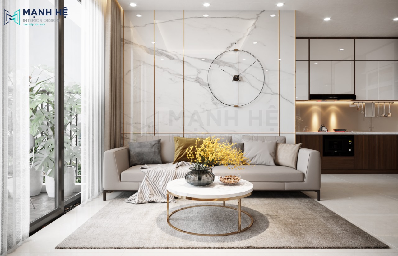 Phòng khách hiện đại với gam màu trắng thanh lịch, nhẹ nhàng. Ốp tường đá vân mây kết hợp đường ron vàng tinh tế. Bộ ghế sofa chữ I cùng bàn trà và thảm lót tinh tế. Tối ưu ánh sáng căn phòng nhờ thiết kế rèm cửa 2 lớp và đèn led âm trần.