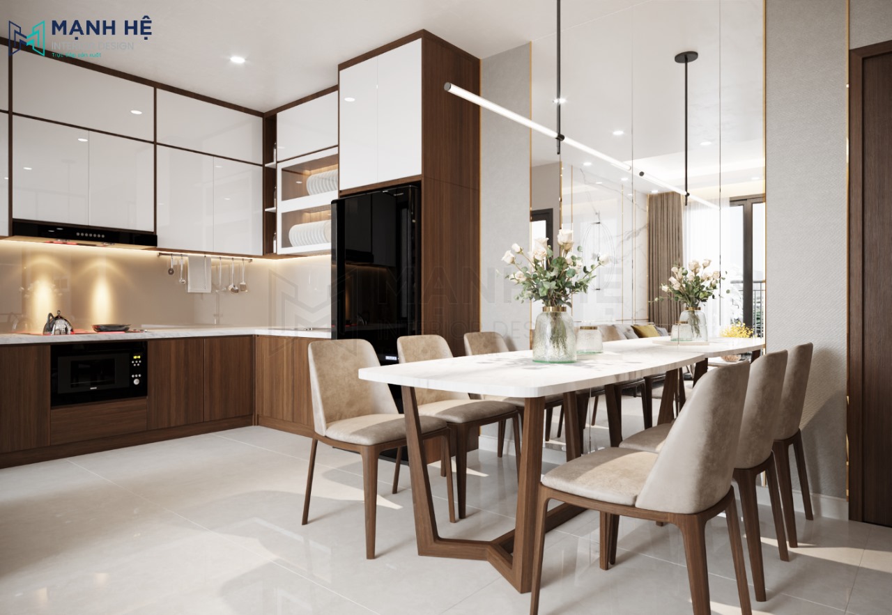Kính thủy ốp tường cạnh bàn ăn, chất liệu bồ bàn ăn được làm từ gỗ công nghiệp. Bề mặt tủ bếp trên phủ acrylic sáng bóng, các ngăn hộc có diện tích vừa phải làm nơi lưu trữ chén bát và đồ khô cho gia chủ. Ốp kính cho khoảng trống giữa tủ bếp trên và tủ bếp dưới tạo cảm giác sạch sẽ khi lau chùi.