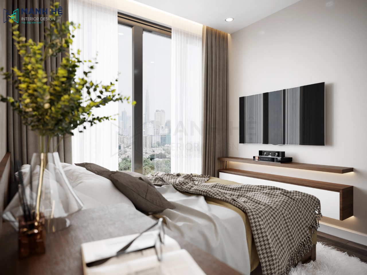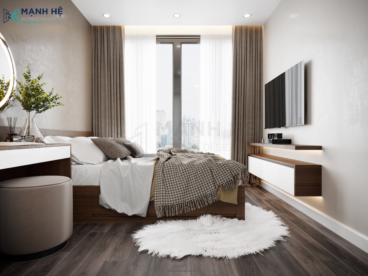 Phòng ngủ master theo phong cách hiện đại với gam màu nâu gỗ chủ đạo. Nội thất cơ bản gồm: tủ quần áo, giường ngủ, bàn trang điểm, kệ tivi. Lót sàn thảm lông tinh tế, tối ưu ánh sáng bằng rèm cửa và đèn led âm trần.