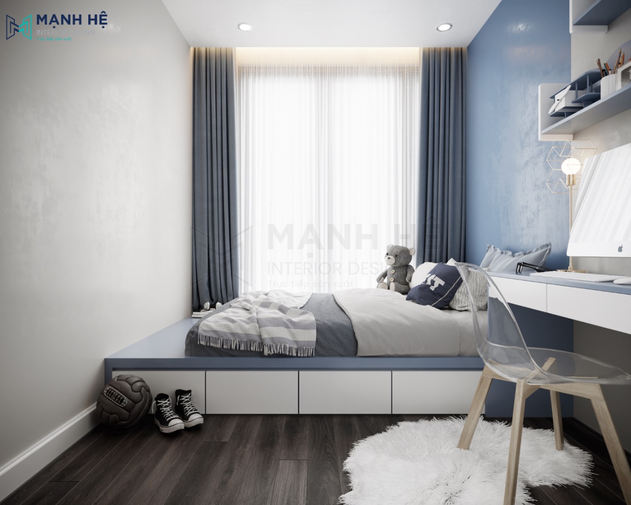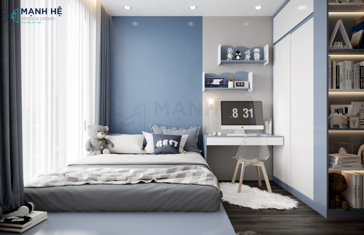 Phòng ngủ cho bé với gam màu xanh năng động, diện tích phòng tương đối nhỏ nhưng vẫn đầy đủ tiện nghi với các nội thất từ gỗ công nghiệp. Nội thất cơ bản gồm: giường ngủ, tủ quần áo tích hợp kệ trang trí, bàn học.