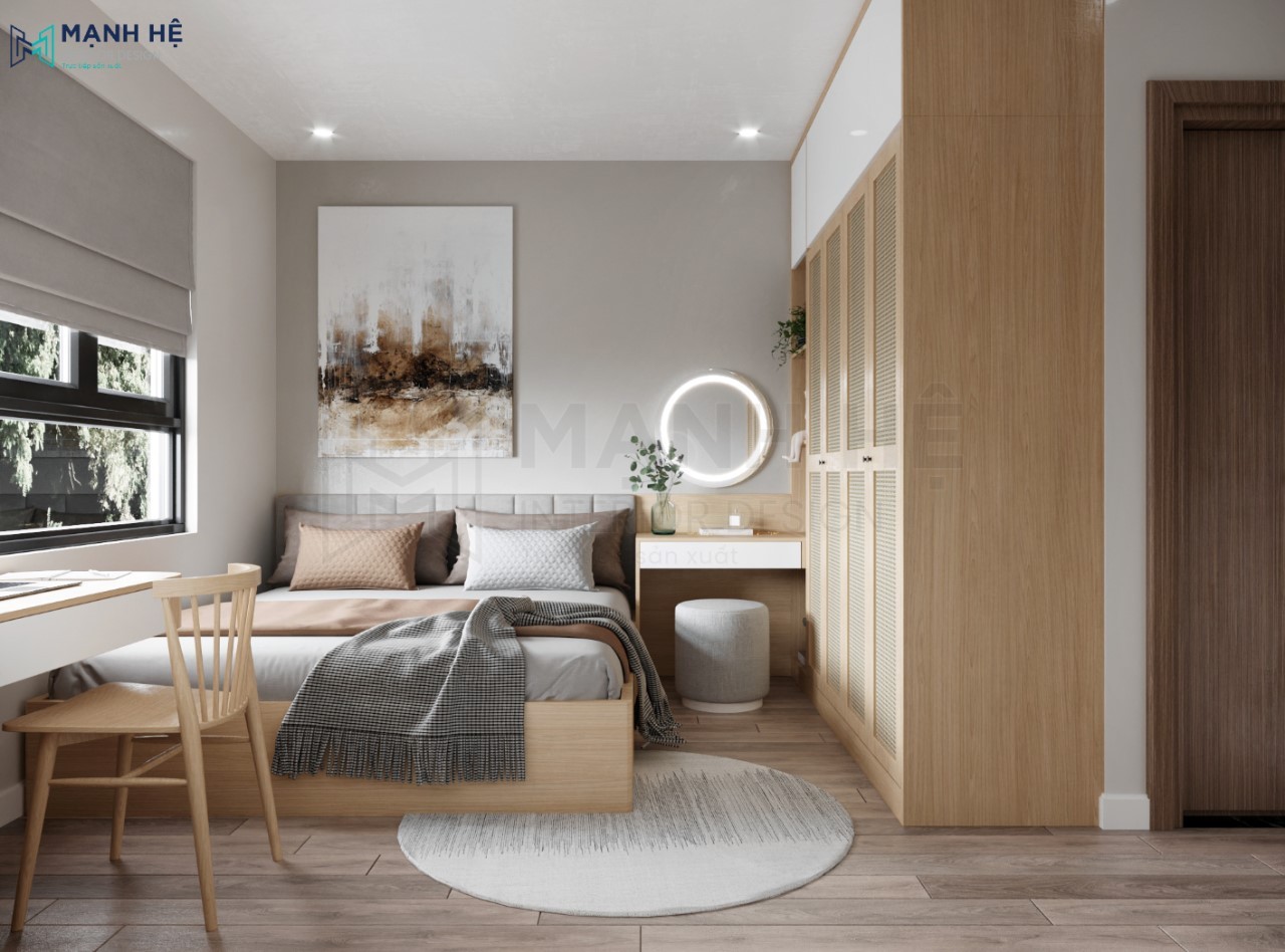 Thiết kế phòng ngủ master với gam màu trung tính nhẹ nhàng, nội thất phòng ngủ với màu vàng nhạt ấn tượng. Tủ quần áo cao đụng trần cánh mở tích hợp thêm bàn làm việc với điểm nhấn gương tròn gắn đèn led rực rỡ. Bố trí giường ngủ với tab đầu giường màu xám, thêm thảm lót tiện nghi. Tận dụng ánh sáng cửa sổ nhờ thiết kế rèm tạo nên không gian nghỉ ngơi thoáng đãng, thoải mái cho gia chủ.