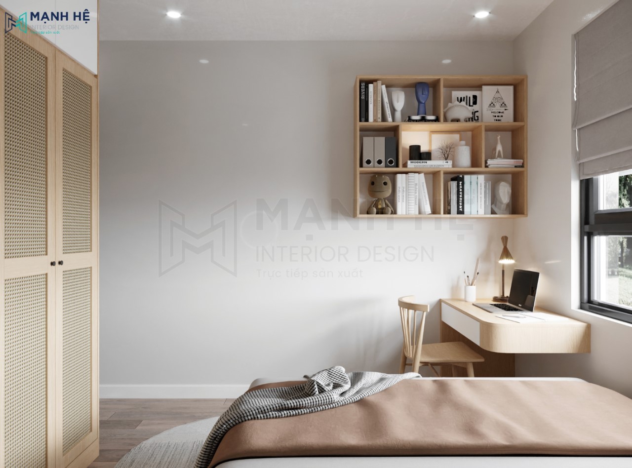 Bàn làm việc và kệ sách treo tường nhỏ gọn đặt cuối giường cho căn phòng có diện tích hạn chế
