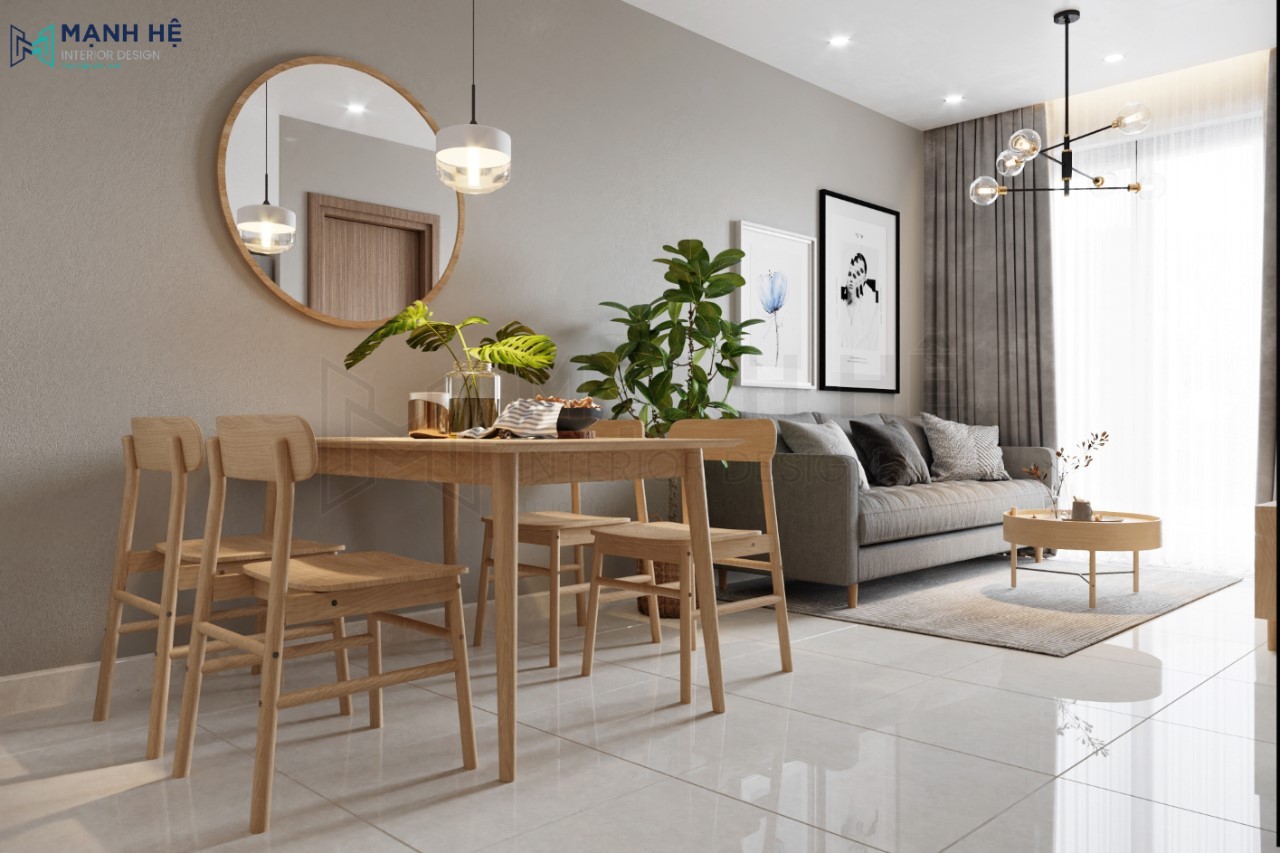 Bố trí bàn ăn ở giữa gian khách và gian bếp để tiện nghi khi di chuyển, decor gương tròn bắt mắt đồng bộ màu với bàn ăn. Thêm chậu cây để tạo cảm giác thoáng đãng, mát mẻ.